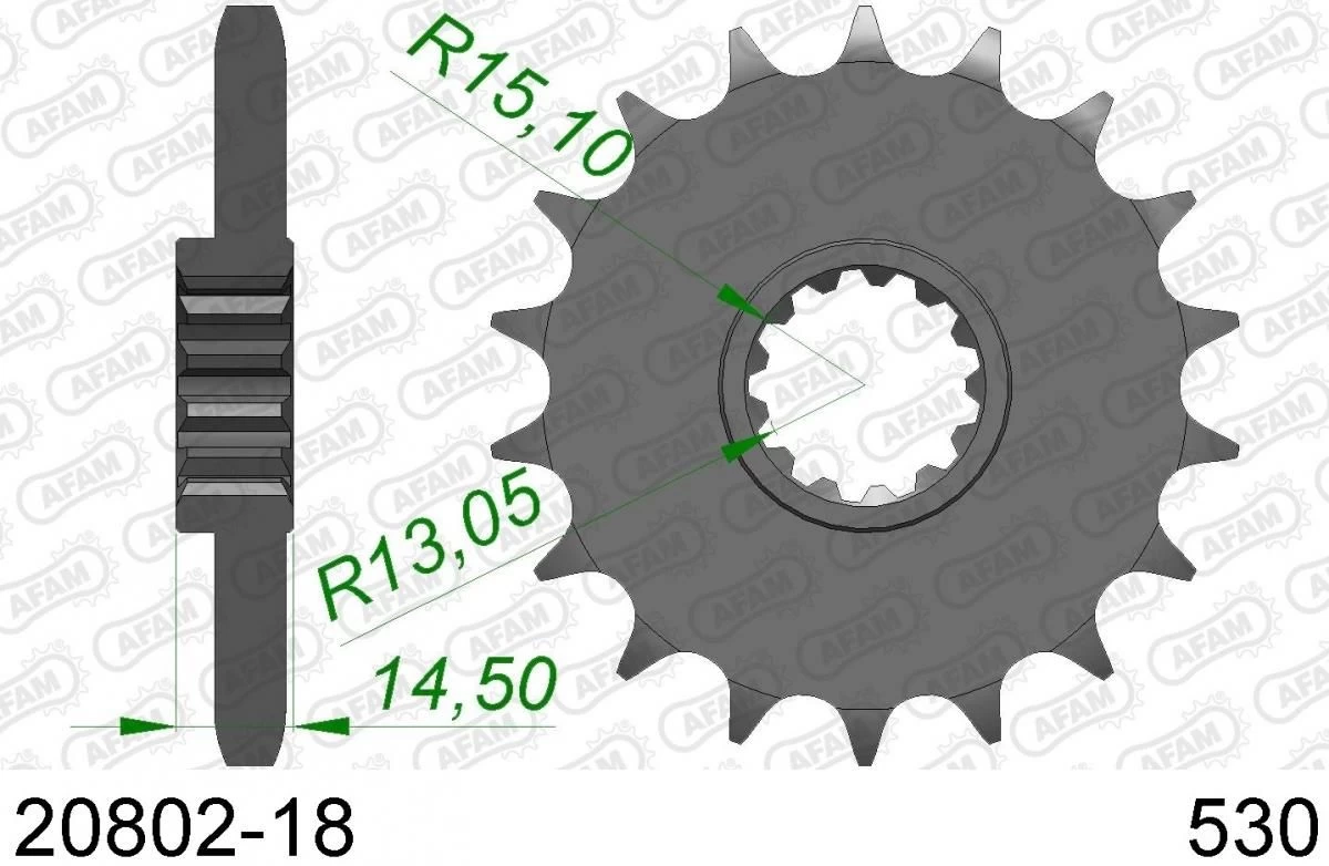 Een stalen 18 tands AFAM voortandwiel. De tandwielen van AFAM zijn gemaakt van C45 staal met inductie geharde tanden, het tandprofiel is concentrisch, plat en perfect rond. Door deze samenstelling zijn de AFAM tandwielen perfect ter vervanging of zelfs ter verbetering van de OEM tandwielen.