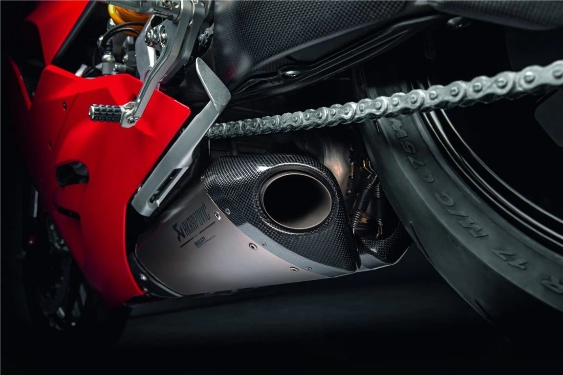 Het onmiskenbare Ducati-ontwerp wordt gecombineerd met het bekwame vakmanschap van Akrapovič om het meeste uit een slip-on-systeem te halen. De uitlaat is volledig gemaakt van titanium en ontwikkeld in samenwerking met Ducati Corse. Het transporteert al het gruis van de Panigale en zorgt naast een aanzienlijke toename in koppel en vermogen voor een gewichtsvermindering in vergelijking met de standaard uitlaat. Compleet met race-afgeleide polyester luchtfilter dat, behalve dat het beter doorlaatbaar is, een uitstekende filterkracht en eenvoudig onderhoud garandeert. Het is uitgerust met een speciale motorkaart om aan specifieke race-eisen te voldoen en maximale prestaties te garanderen.