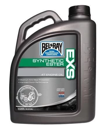 Vol synthetische motor olie gemaakt door Bel-Ray. EXS is specifiek samengesteld voor onovertroffen bescherming en prestaties in alle motoren. EXS is ontwikkeld tijdens de wereldkampioenschappen Superbikes. EXS is samengesteld uit hoogpolaire synthetische basisolien en Bel-Ray’s exclusieve additievenpakket ter bescherming van de motor, de versnellingsbak en de koppeling onder de zwaarste omstandigheden en bij hoge temperaturen. Wordt geleverd in een flacon van 4 liter met handige schenkdop.
