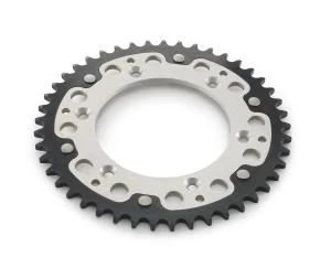 Tanden van hoogwaardig staal voor een extra lange levensduur. Aluminium middendeel vermindert onafgeveerde massa. Permanent verbonden met zeer sterke klinknagels biedt dit tandwiel minstens drie keer langere levensduur dan andere aluminium achtertandwielen en is 50 % lichter dan stalen achtertandwielen. Langere levensduur van de gehele aandrijflijn