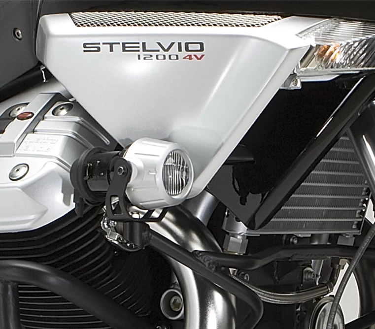 MOTO GUZZI ENDURO aanvullende verlichtingset. De mistlampen zijn goedgekeurd voor gebruik op de weg en gemaakt van magnesium en aluminiumlegering.