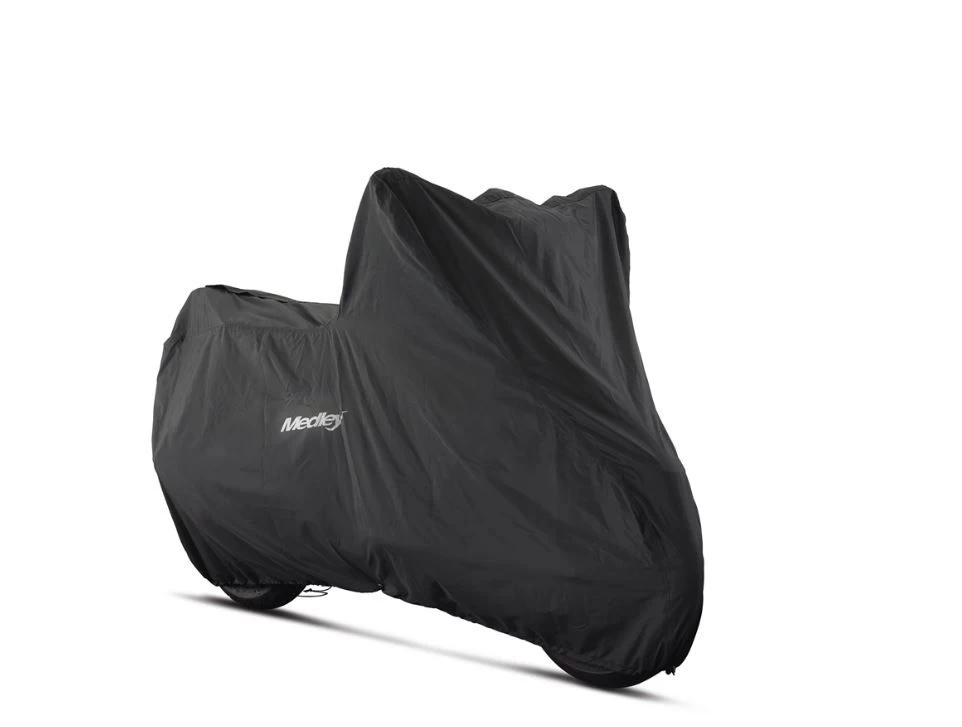 Beschermhoes met openingen voor accessoires. Kleur zwart met reflector strip, transparante kentekenplaat venster . Piaggio logo.