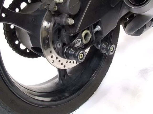 Wanneer er geen schroefdraad in de achterbrug is om een bobbin te monteren kan de R&G “Offset Cotton Reels” gebruikt worden. Zo kan er via de kettingspanner/achteras toch een bobbin op de motor gemonteerd worden en kan de motor dus met een paddockstand veilig en stevig gestald worden. Ook beschermen de bobbins de achterbrug bij een val.