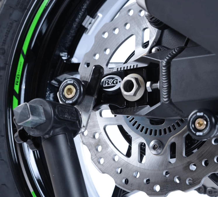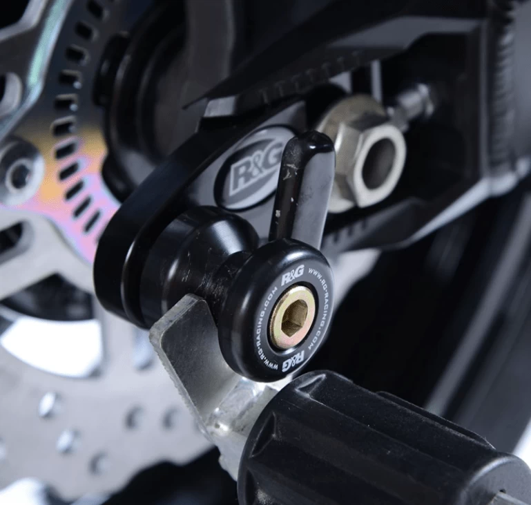 Wanneer er geen schroefdraad in de achterbrug is om een bobbin te monteren kan de R&G “Offset Cotton Reels” gebruikt worden. Zo kan er via de kettingspanner/achteras toch een bobbin op de motor gemonteerd worden en kan de motor dus met een paddockstand veilig en stevig gestald worden. Ook beschermen de bobbins de achterbrug bij een val.