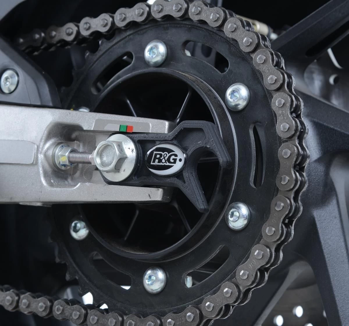Wanneer er geen schroefdraad in de achterbrug is om een bobbin te monteren kan de R&G “Offset Cotton Reels” gebruikt worden. Zo kan er via de kettingspanner/achteras toch een bobbin op de motor gemonteerd worden en kan de motor dus met een paddockstand veilig en stevig gestald worden. Ook beschermen de bobbins de achterbrug bij een val.