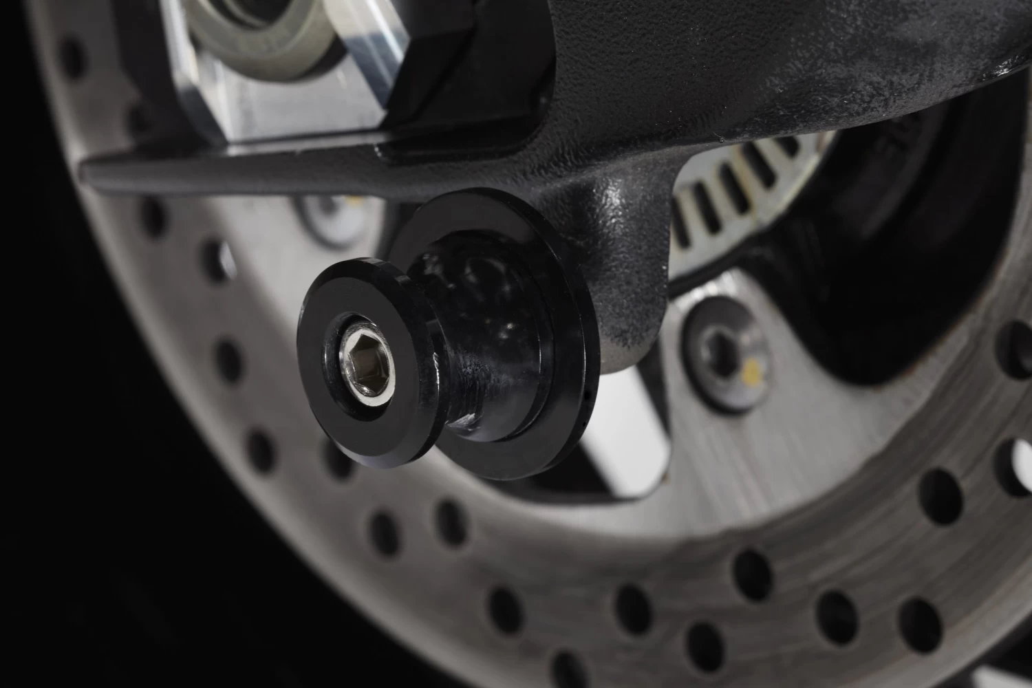 Met deze zwarte bobbins met grote adapters zet je de motorfiets gemakkelijk en zonder krassen op een paddock stand.