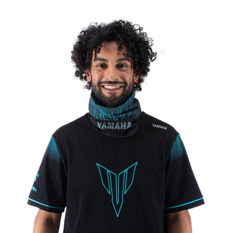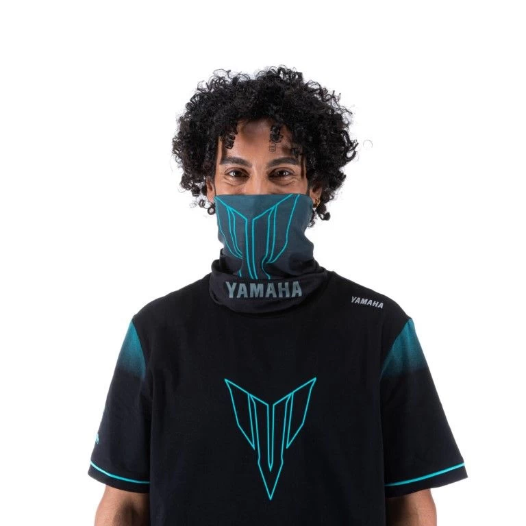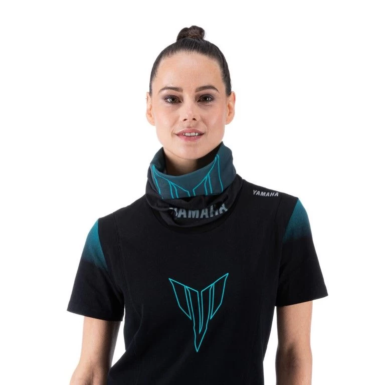 De Hyper Naked nekwarmer is de perfecte aanvulling op de volledige kledinglijn en is een zeer aanpasbaar item voor rijden op verharde wegen en verkennen in de buitenlucht. De uitvoering in polyester met ‘stealth’ zwart vervagend naar cyaan zorgt voor een zeer zacht gevoel dat de elementen buiten houdt. Een gesublimeerd MT-logo en het Yamaha-logo zorgen voor een stedelijke look die helemaal bij de Dark Side past.